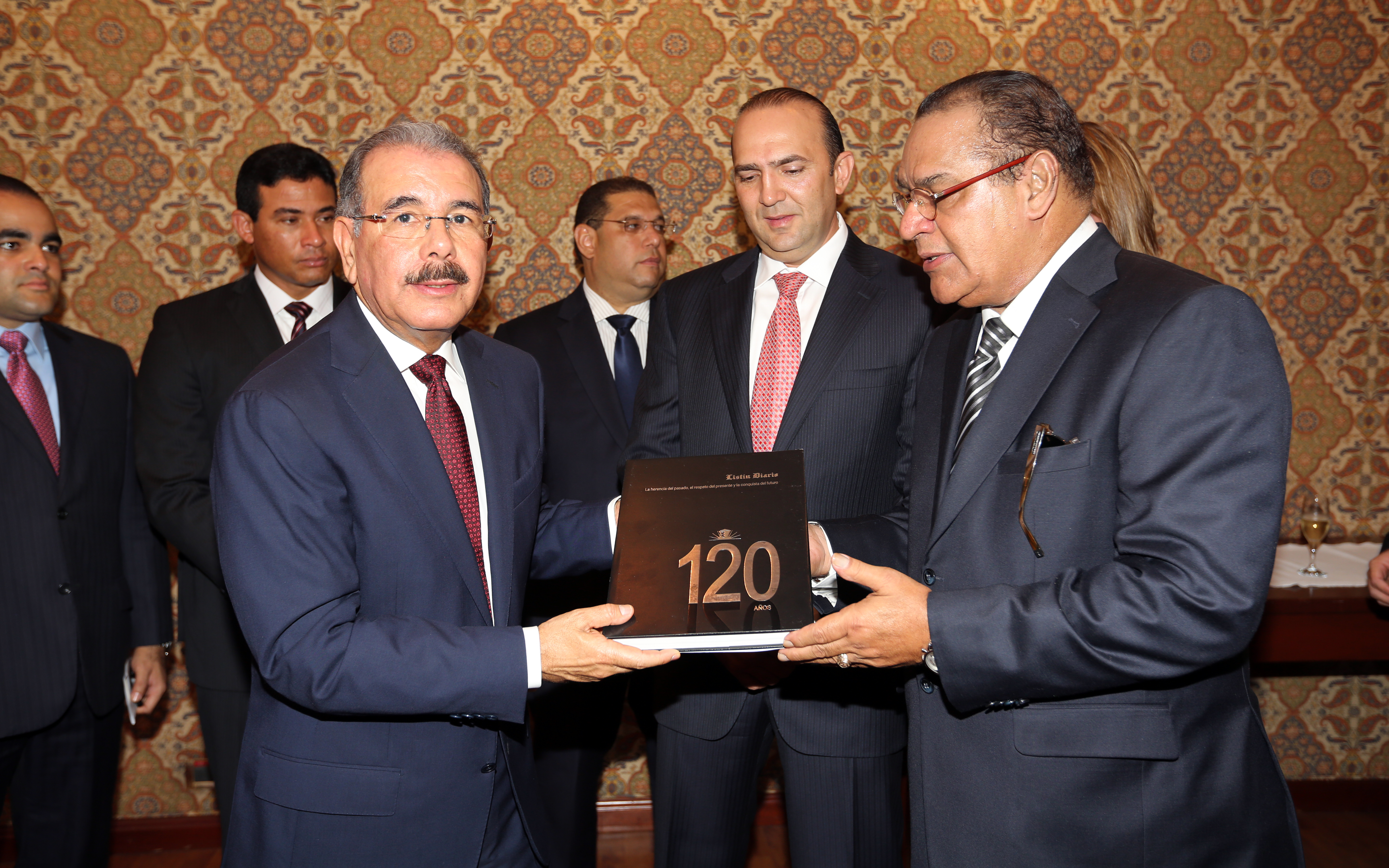 El presidente Medina recibe el libro histórico del Listín Diario, de manos Miguel Franjul, director de ese medio.