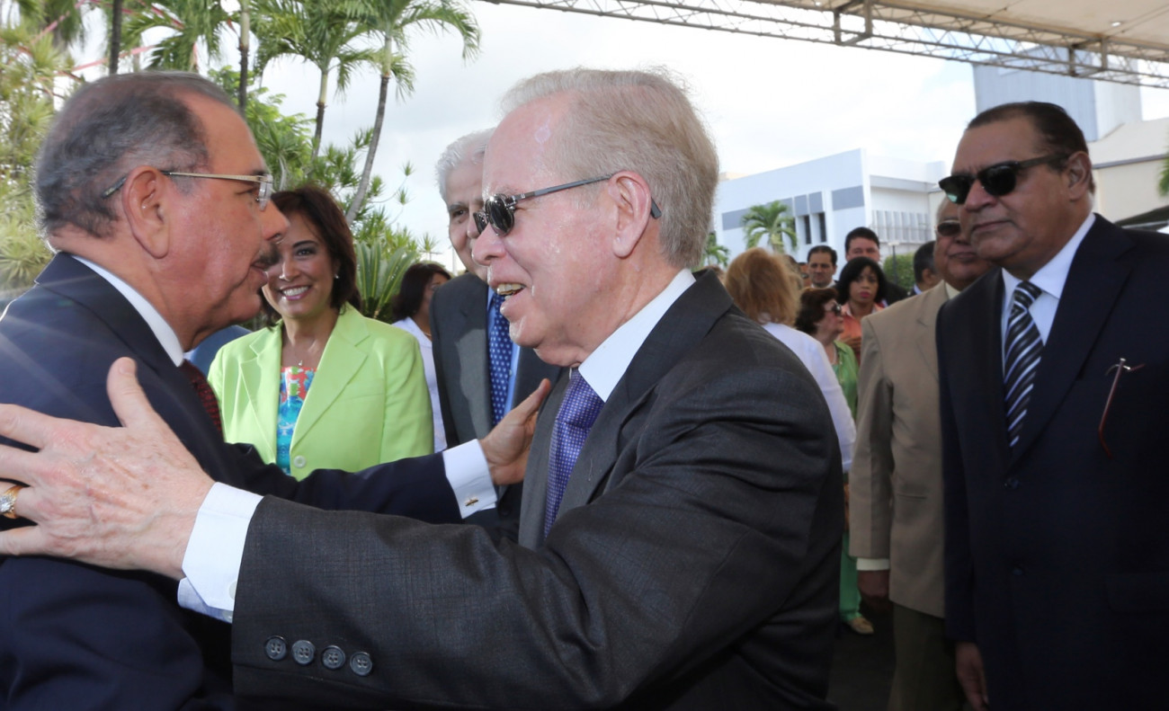 El presidente Danilo Medina saluda al empresario don José Luis(don Pepín) Corripio Estrada, al encabeza el acto de develizamiento del busto de don Rafael Herrera (1912-1994), en ocasión de celebrarse el 50 aniversario de la reapertura del periódico Listín Diario.