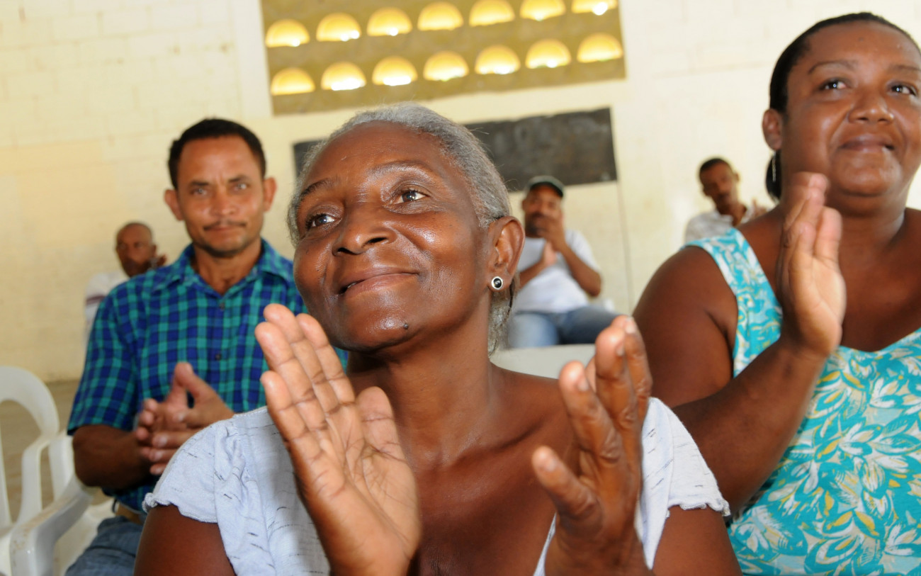 Integrantes del Club de Amas de Casa Cruce de Futuro, presentes en la actividad aplauden tras recibir financiamiento del Gobierno, dispuesto por el presidente Medina en su visita anterior.