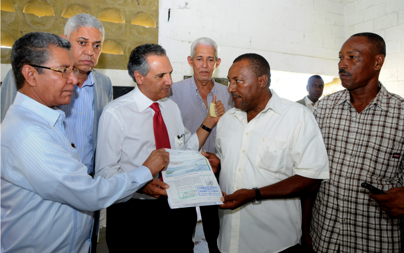 José Ramón Peralta, ministro administrativo de la Presidencia, acompañado de representantes del Parque Industrial de San Cristóbal, presentes en el acto al recibir los fondos dispuestos por el Mandatario en su última visita a la zona.