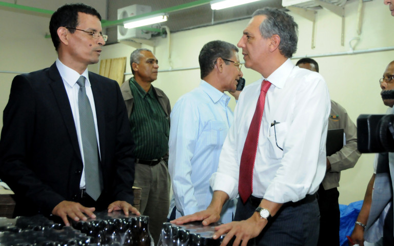 José Ramón Peralta, ministro Administrativo de la Presidencia y empresario del Parque Industrial de San Cristóbal, presente en el acto, durante recorrido por la sección de empaque de la industria.