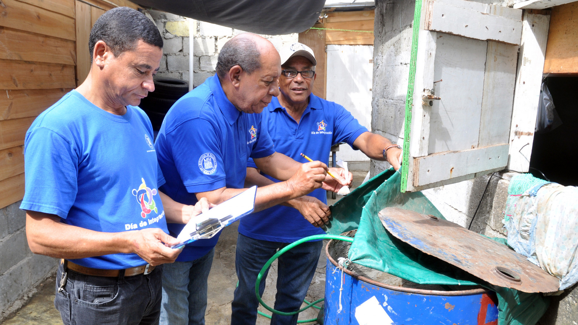 Empleados y funcionarios del Ministerio de Hacienda participaron hoy en la Jornada Nacional para erradicar los criaderos del mosquito transmisor del dengue, zika y chikungunya, coordinado por el Ministerio de Salud Pública, en el barrio Los Santos, de Santiago de los Caballeros.