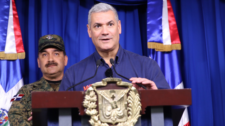 Representantes del Centro de Operaciones de Emergencias, encabezados por el director del COE, general Juan Manuel Méndez; la directora de la Oficina Nacional de Meteorología (ONAMET), Gloria Ceballos; el director de la Defensa Civil, mayor general Rafael de Luna Pichirilo; y ministro de Obras Públicas, Gonzalo Castillo, para informar sobre activa onda tropical al sur del país.