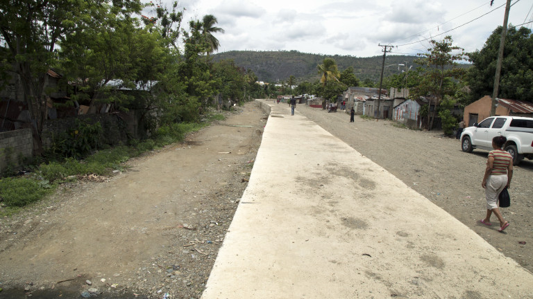 Obreros trabajan en la construcción de calles para conectar la zona remodelada con el centro de La Vega.