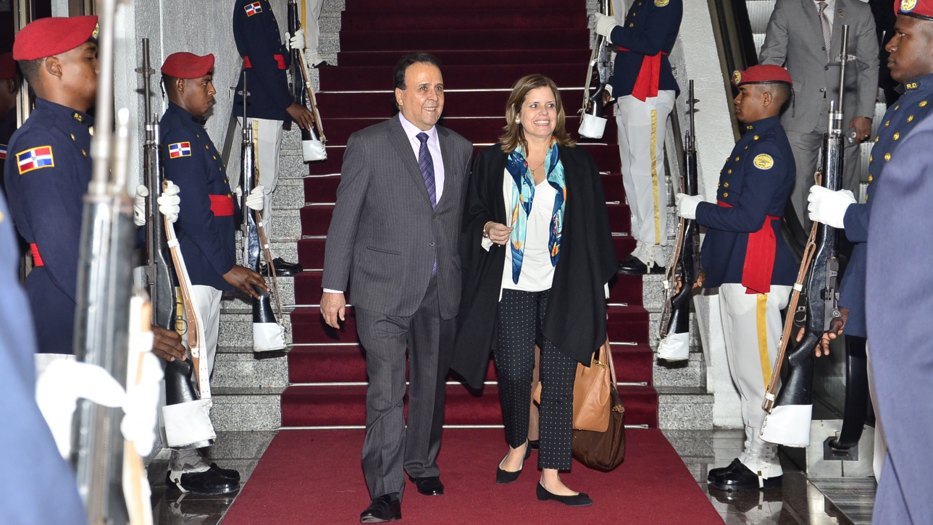 Señora Mercedes Aráoz, vicepresidenta del Perú y acompañante, al momento de llegar al país para asistir a la Juramentación del presidente Danilo Medina y la vicepresidenta Margarita Cedeño de Fernández, período 2016-2020.