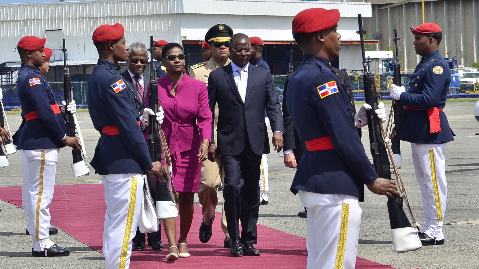 Junto al jefe de Estado haitiano arribaron la Primera Dama, Ginette Michaud Privert, el ministro de Asuntos Exteriores, Pierrot Delienne; la ministra de Comercio, Jessy C. Petit-Frere; los consejeros Idalbert Pierre-Jean, Denise Poulard e Yvrose Joseph, respectivamente.