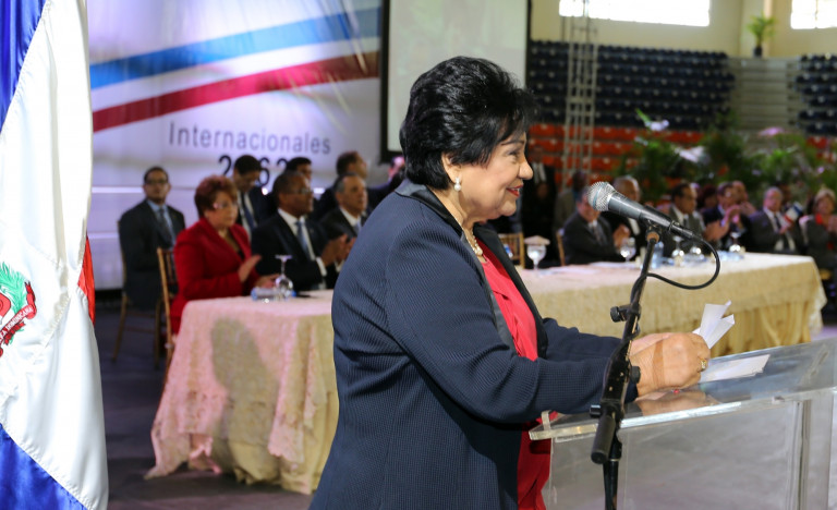 La ministra de Educación Superior, Ciencia y Tecnología, doña Ligia Amada Melo, durante su discurso en el acto de entrega de becas,y quien expresó que la actividad, es el resultado del significativo apoyo del presidente Danilo Medina, al programa de becas.