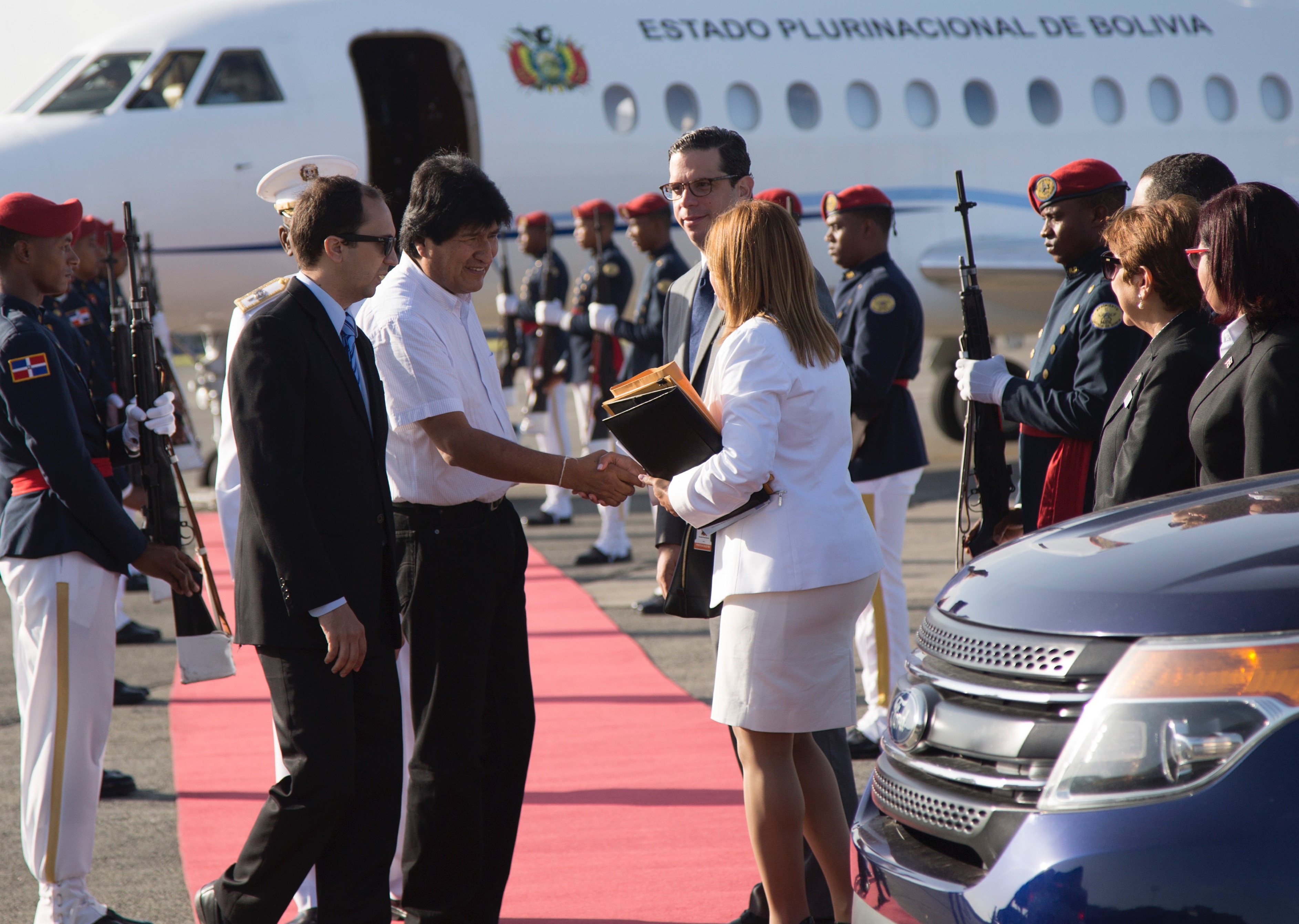 Llegada del presidente de Bolivia, Evo Morales, a República Dominicana para asistir a juramentación de su homólogo dominicano Danilo Medina y la vicepresidenta Margarita Cedeño de Fernández, a celebrarse este martes 16 de agosto de 2016.