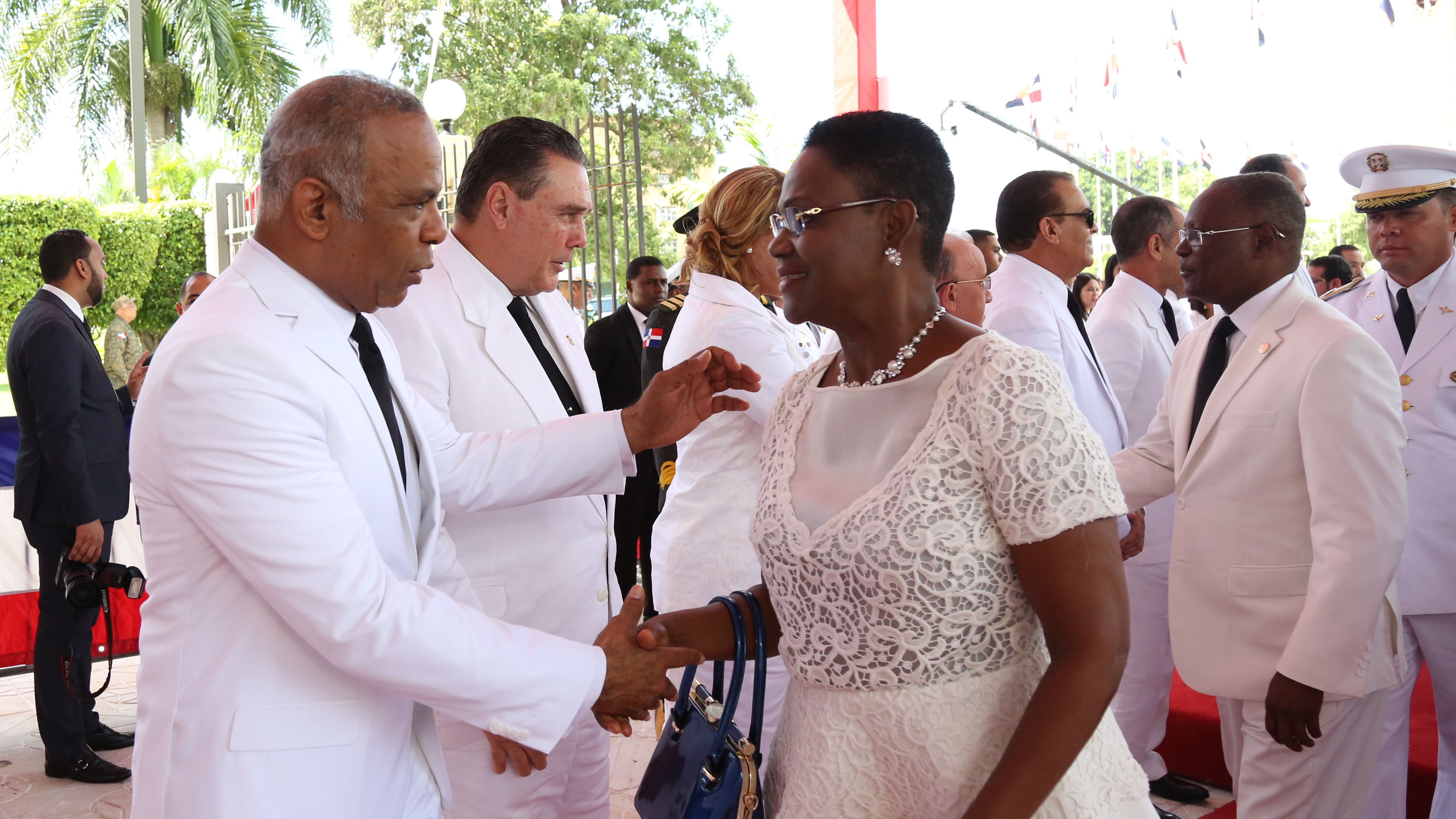 El presidente de Haití, Jocelerme Privert, y su esposa, reciben saludos de bienvenida a su llegada al Congreso Nacional para participar en la toma de posesión del presidente Danilo Medina.