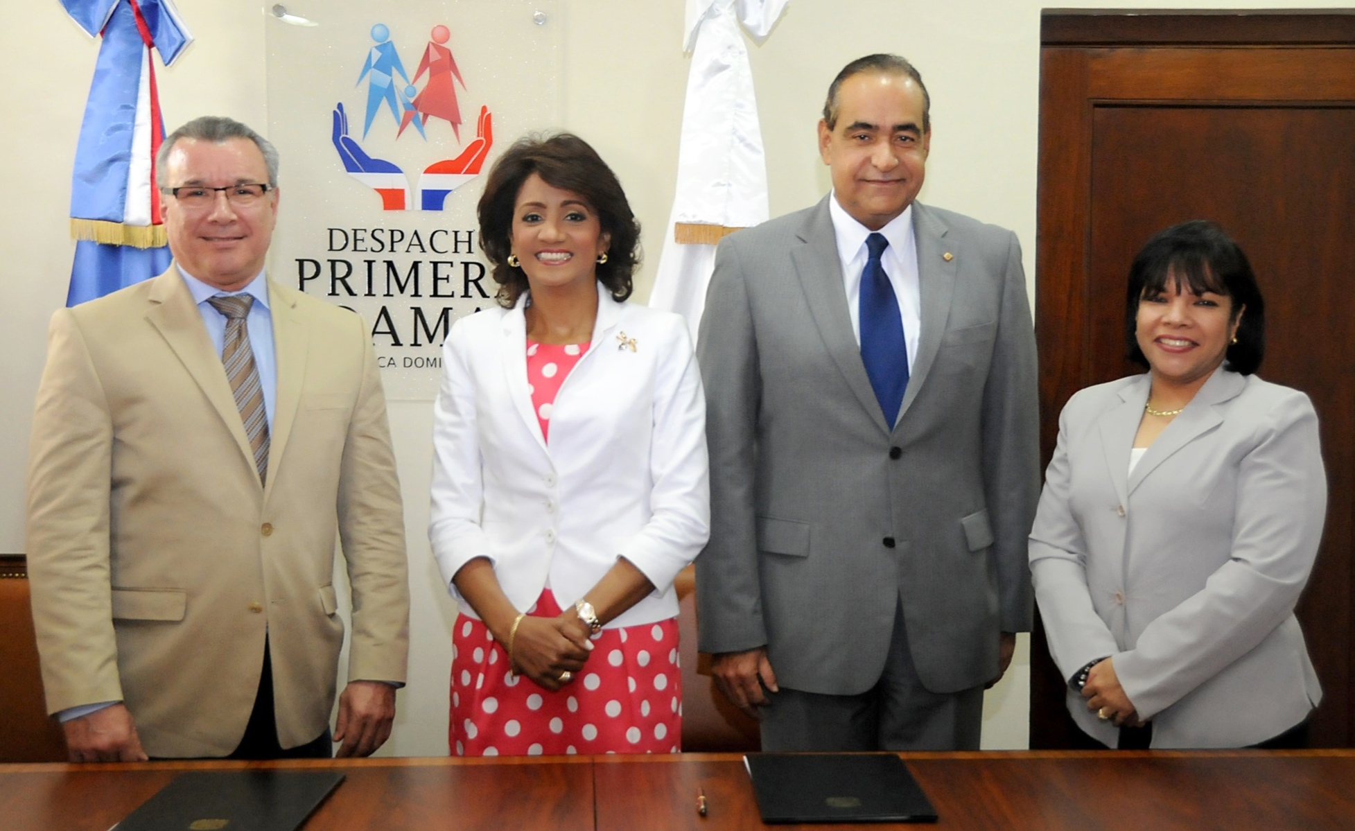 Desde la izquierda figuran el doctor Moisés Taveras, director general del CAID, la primera dama de la República, Cándida Montilla de Medina, Julio Amado Castaños Guzmán, rector de UNIBE y Martha Rodríguez, coordinadora técnica y administrativa del Despacho de la Primera Dama, durante el acto protocolar de firmas.