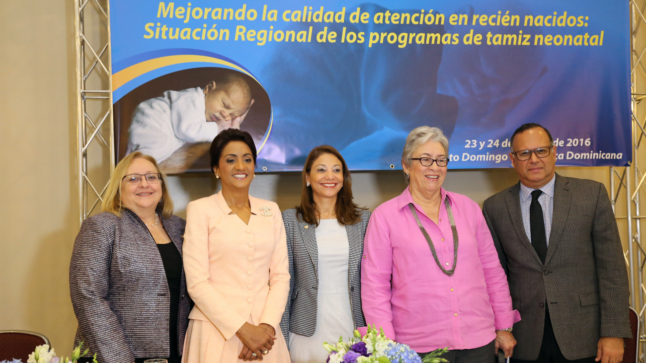 La primera dama Cándida Montilla de Medina refirió que su Despacho ha asumido el liderazgo en el país de un proyecto de tamizaje neonatal, que avanza firme, con el inicio en diciembre pasado de la construcción del primer laboratorio en el que serán analizadas las muestras. Le acompañan, la ministra de Salud Pública, Altagracia Guzmán Marcelino; el director del Servicio Nacional de Salud, Nelson Rodríguez Monegro; entre otras personalidades.