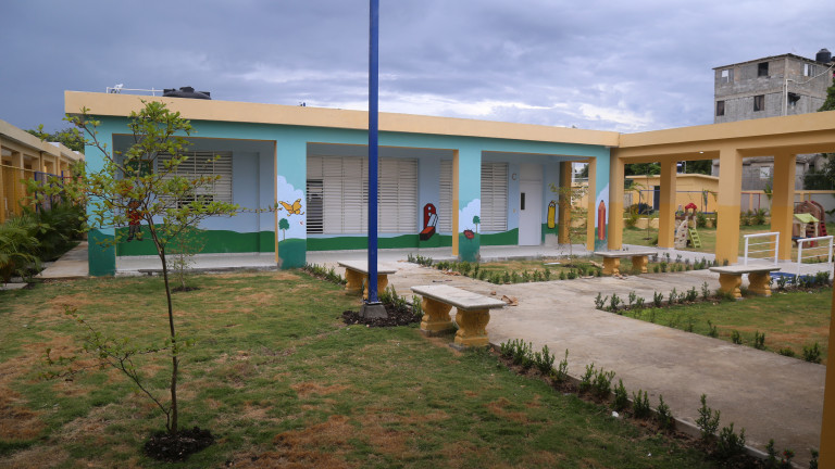 Vista de la nueva Escuela Básica Kelbyn Obrero de Paz, ubicada en el sector Los Frailes, en Santo Domingo Este, que entregará hoy el presidente Danilo Medina.