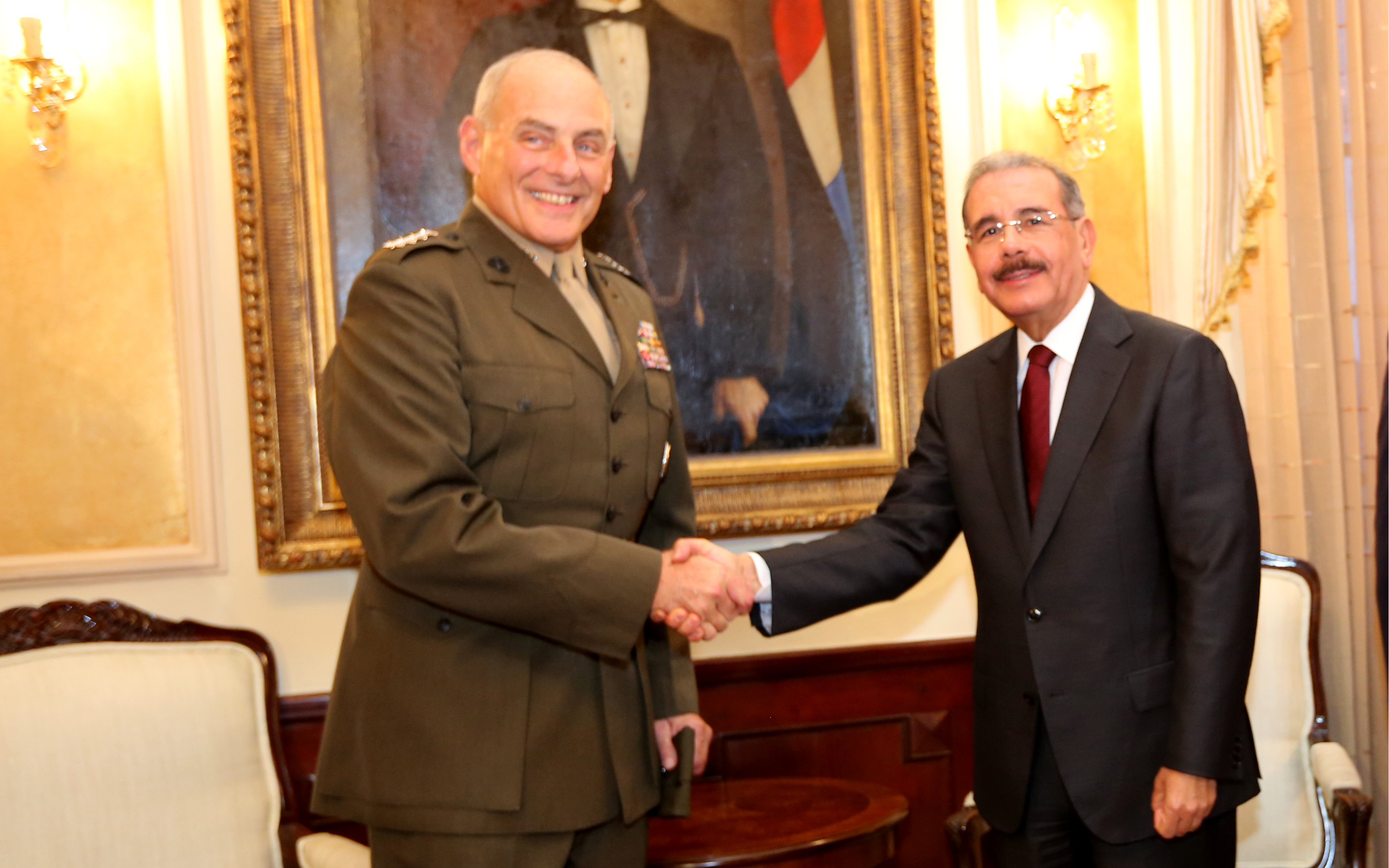El presidente Danilo Medina y el jefe del Comando Sur de los Estados Unidos, John Kelly, al ser recibido en el despacho del Palacio Nacional.
