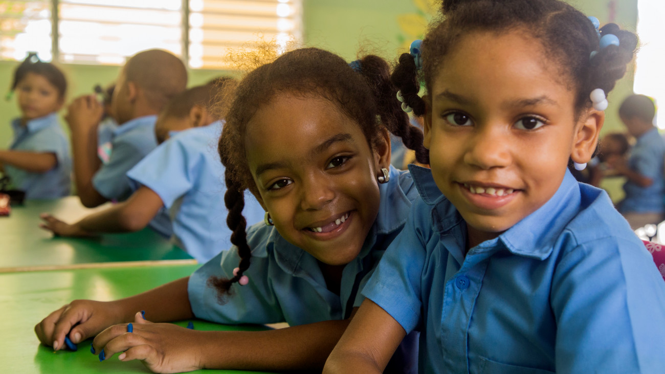 Estudiantes con caritas felices de la Escuela Digna Celeste Nova con Jornada Escolar Extendida, gracias a la revolución educativa implementada por el presidente Danilo Medina.