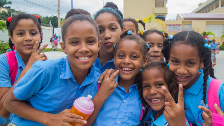 Estudiantes con caritas felices de la Escuela Digna Celeste Nova, con Jornada Escolar Extendida, gracias a la revolución educativa implementada por el presidente Danilo Medina.