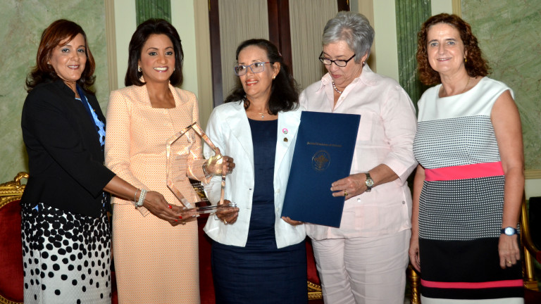 La primera dama, Cándida Montilla de Medina, entrega reconocimiento a la Dra. Caridad Francisco Capellán, galardonada en el renglón Servicio Social, del Premio Nacional de Pediatría 2016. Les acompañan, la ministra de Salud, Dra. Altagracia Guzmán Marcelino; la Dra. Sandra Orisini, presidenta de la Sociedad Dominicana de Pediatría; y Rosa Elcarte, representante de UNICEF en el país.