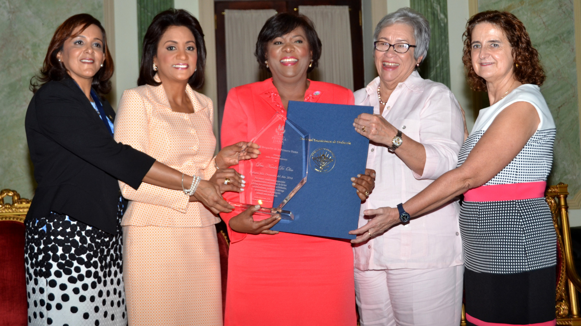 La primera dama Cándida Montilla de Medina entrega el máximo galardón a la Dra. Narda Cristina de D’Oleo Montero, reconocida como Pediatra más destacada, del Premio Nacional de Pediatría 2016. Les acompañan, la ministra de Salud, Dra. Altagracia Guzmán Marcelino; la Dra. Sandra Orisini, presidenta de la Sociedad Dominicana de Pediatría; y Rosa Elcarte, representante de UNICEF en el país.