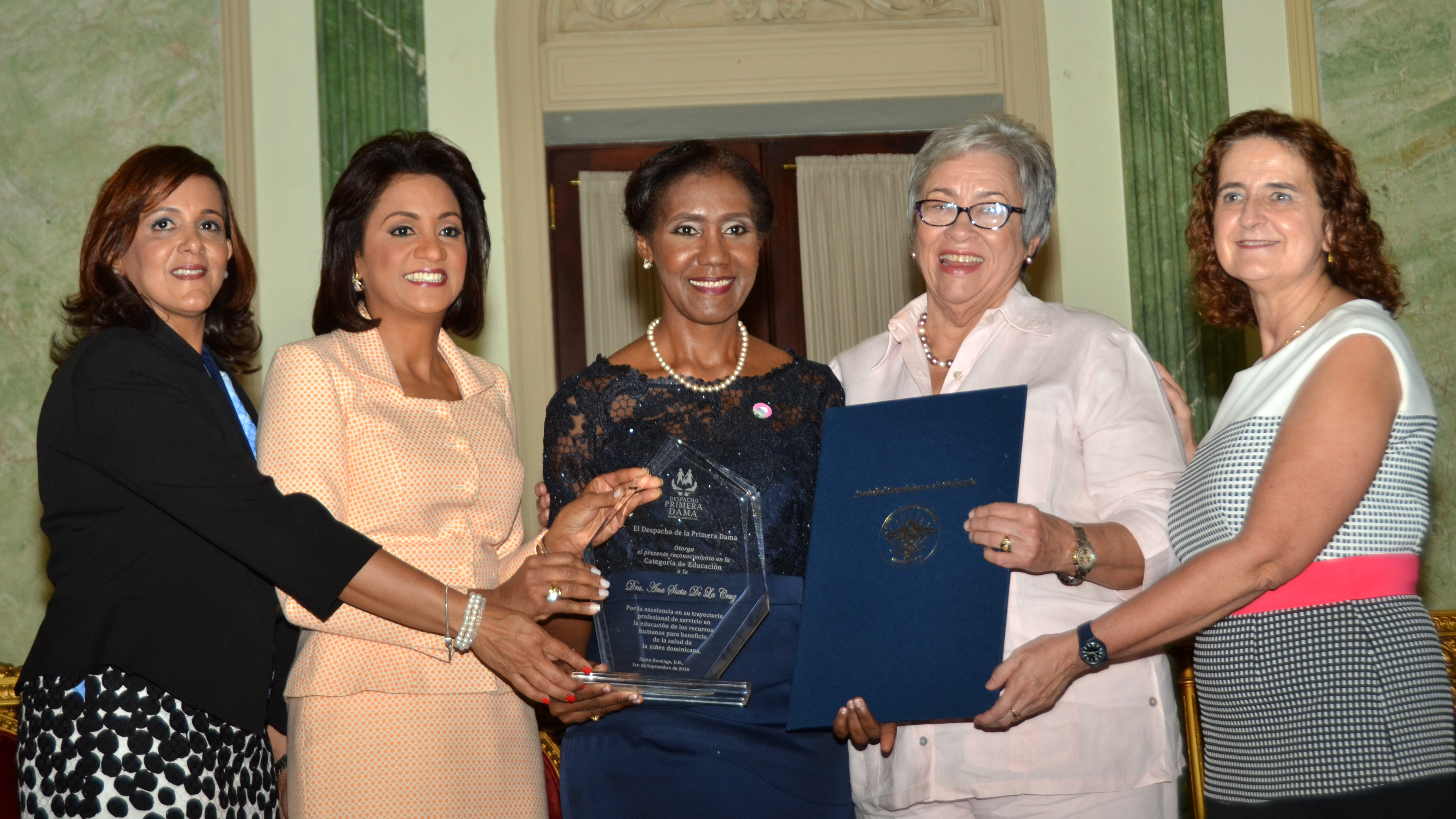 Dra. Ana Sixta de la Cruz, reconocida en el renglón Educación, del Premio Nacional de Pediatría 2016, al momento de recibir su galardón de manos de la señora Montilla de Medina. Les acompañan, la ministra de Salud, Dra. Altagracia Guzmán Marcelino; la Dra. Sandra Orisini, presidenta de la Sociedad Dominicana de Pediatría; y Rosa Elcarte, representante de UNICEF en el país.