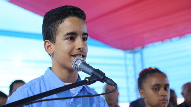 Frailyn Báez es estudiante de octavo grado de la Escuela Básica Ángel Emilio Casado. En sus palabras de agradecimiento, expresó: "Adelante, pueblo, que la educación es la herencia que nunca se pierde; en esta gestión, la educación es prioridad".