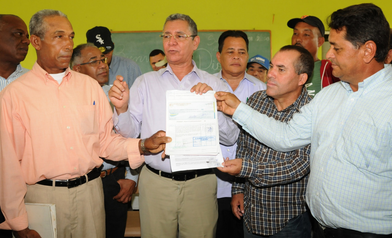 Productores en Las Matas de Santa Cruz, recibiendo de manos del director de FEDA, por instrucciones del señor Presidente, la promesa de ayuda ofrecida en su pasada Visita Sorpresa a esta comunidad.