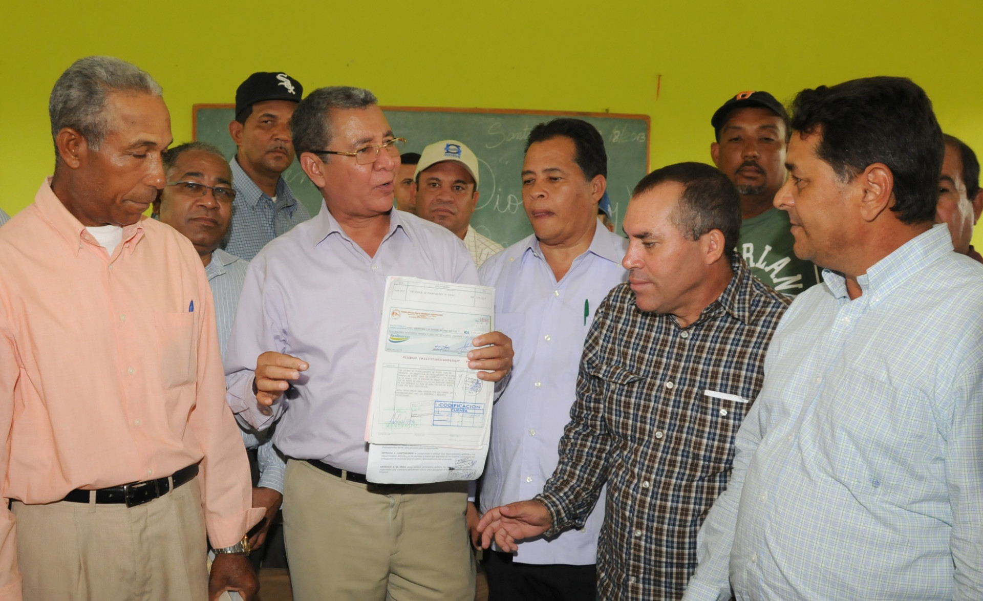 El director del Fondo Especial para el Desarrollo Agropecuario (FEDA), Antonio López, y representantes de productores en Las Matas de Santa Cruz, durante la entrega de fondos efectuada recientemente, cumpliendo compromisos anunciados en pasada visita del presidente de la República Danilo Medina.
