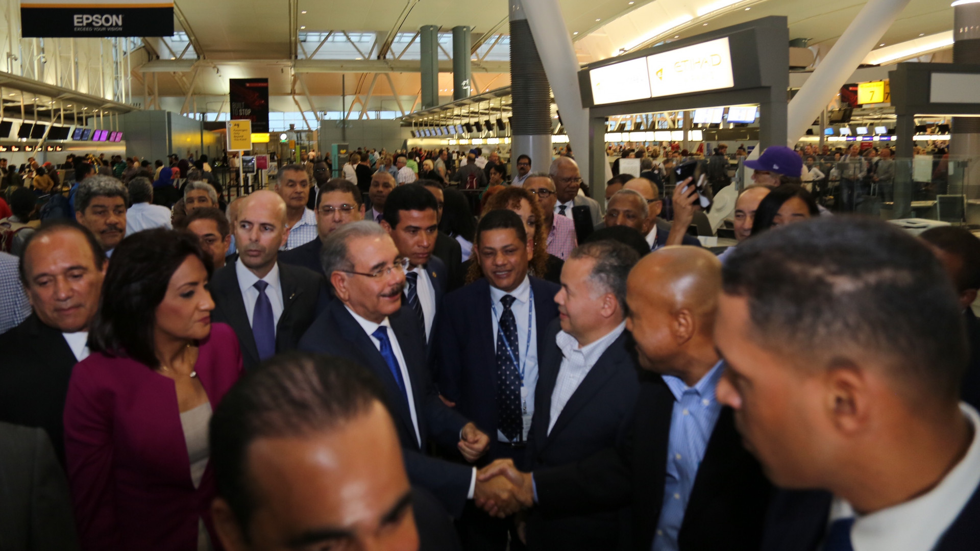 El presidente Danilo Medina llegó al Aeropuerto John F. Kennedy a las 6:00 de la tarde. Fue recibido por el embajador dominicano en Estados Unidos, José Tomás Pérez. También por Frank Cortorreal, embajador dominicano ante la ONU.