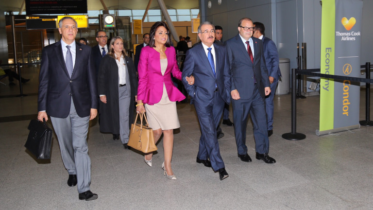 Al presidente Danilo Medina le acompaña su esposa, la primera dama Cándida Montilla de Medina. Además, José Ramón Peralta, ministro Administrativo de la Presidencia. También Carlos Pared, asistente del Presidente. Así como el jefe del Cuerpo de Seguridad Presidencial, mayor general Adán Cáceres.