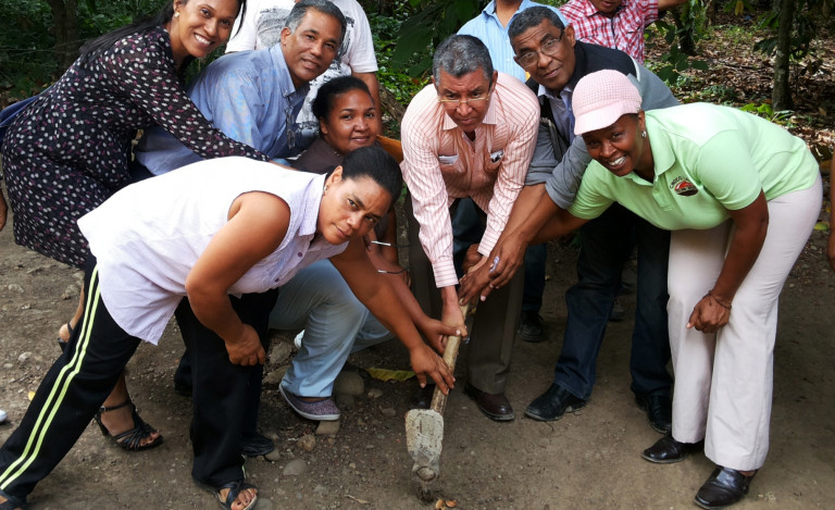 El director de FEDA, Antonio López, y productores agricolas de Altamira, Puerto Plata, dan el primer palazo para el inicio de la construcción de la obra.