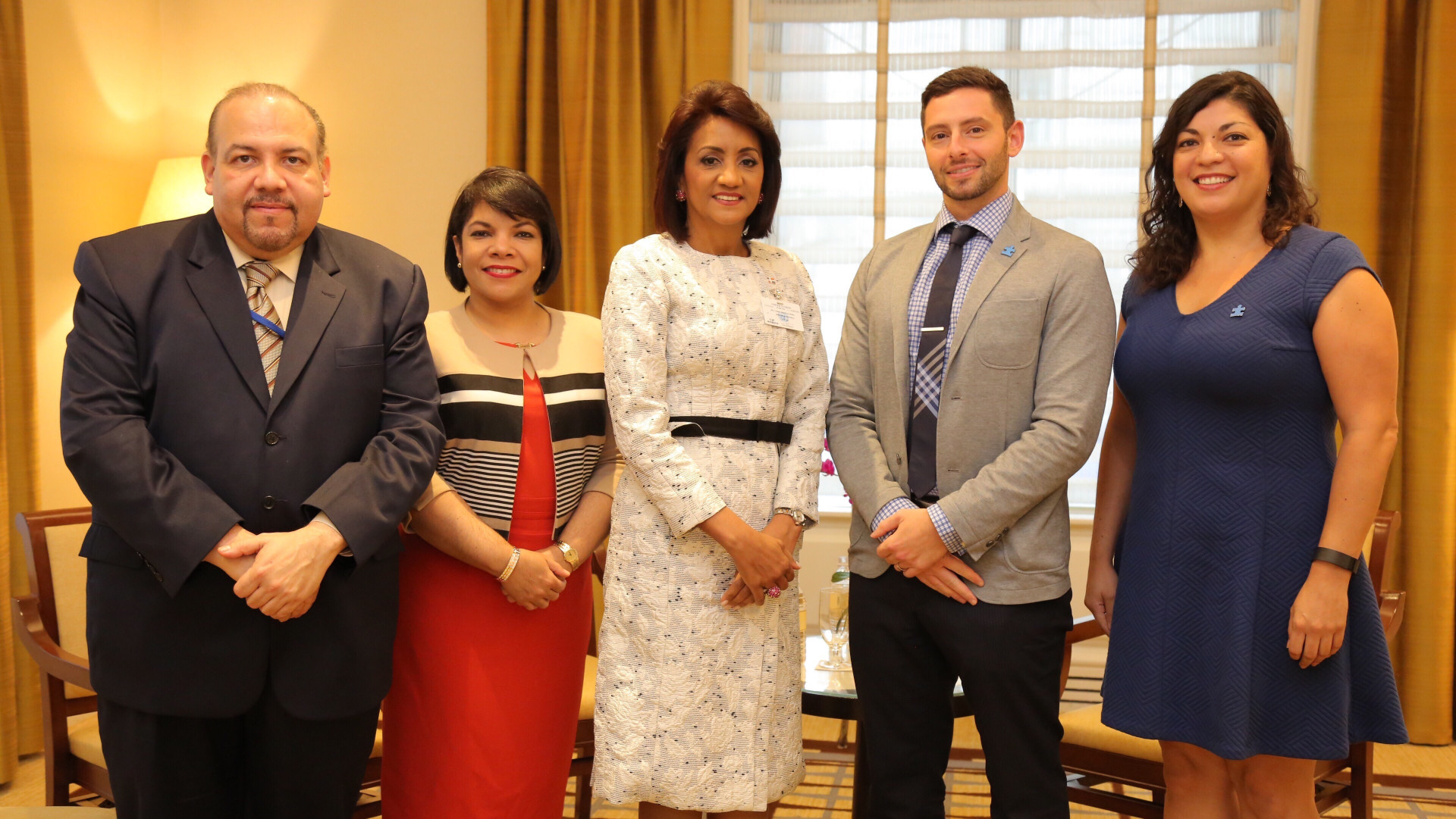La primera dama, Cándida Montilla de Medina junto al director de Autism Speaks, Michael Rosanoff; asistente ejecutiva del director de la entidad, Lucía Murillo; la coordinadora técnica del Despacho, Martha Rodríguez de Báez, y el embajador Miguel Reyes Sánchez, asesor de relaciones internacionales del Despacho.