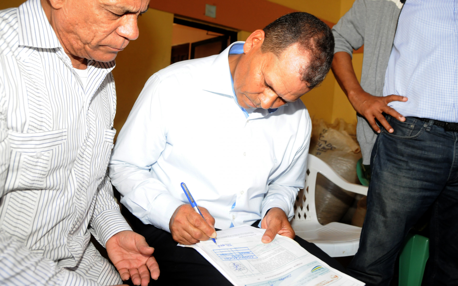 Vista de representantes de asociaciones agrícolas de la comunidad de Joba Arriba, Gaspar Hernández, al recibir los fondos prometidos por el presidente Danilo Medina de manos del director de Fondo Especial para el Desarrollo Agropecuario (FEDA), Antonio López, para financiar proyectos de desarrollo a pequeños y medianos productores agrupados en clústers y cooperativas agrícolas.