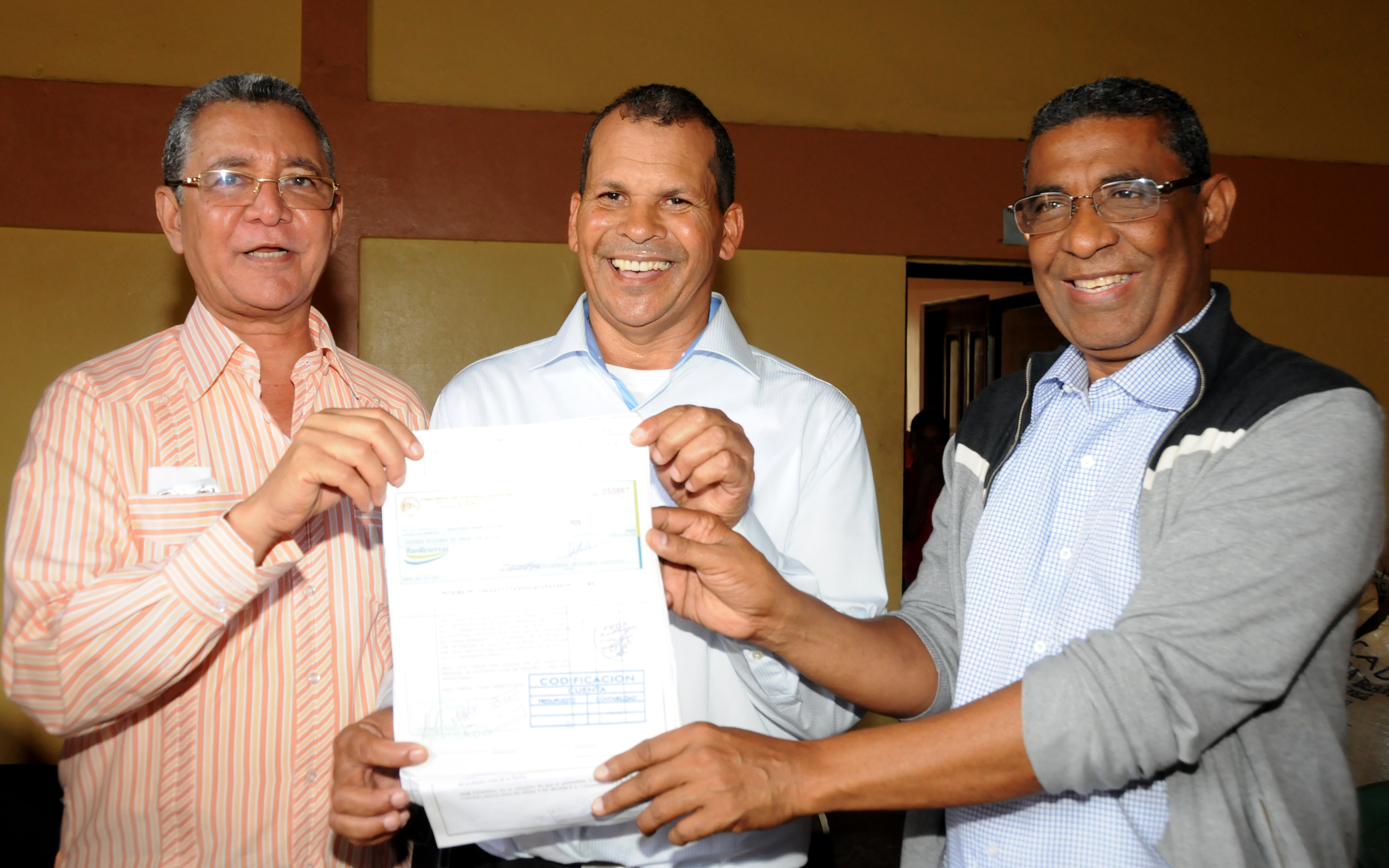El director de Fondo Especial para el Desarrollo Agropecuario (FEDA), Antonio López, al momento de entregar los fondos prometidos por el Mandatario a productores de la comunidad de Joba Arriba, Gaspar Hernández, para financiar proyectos de desarrollo a pequeños y medianos productores agrupados en clústers y cooperativas agrícolas.