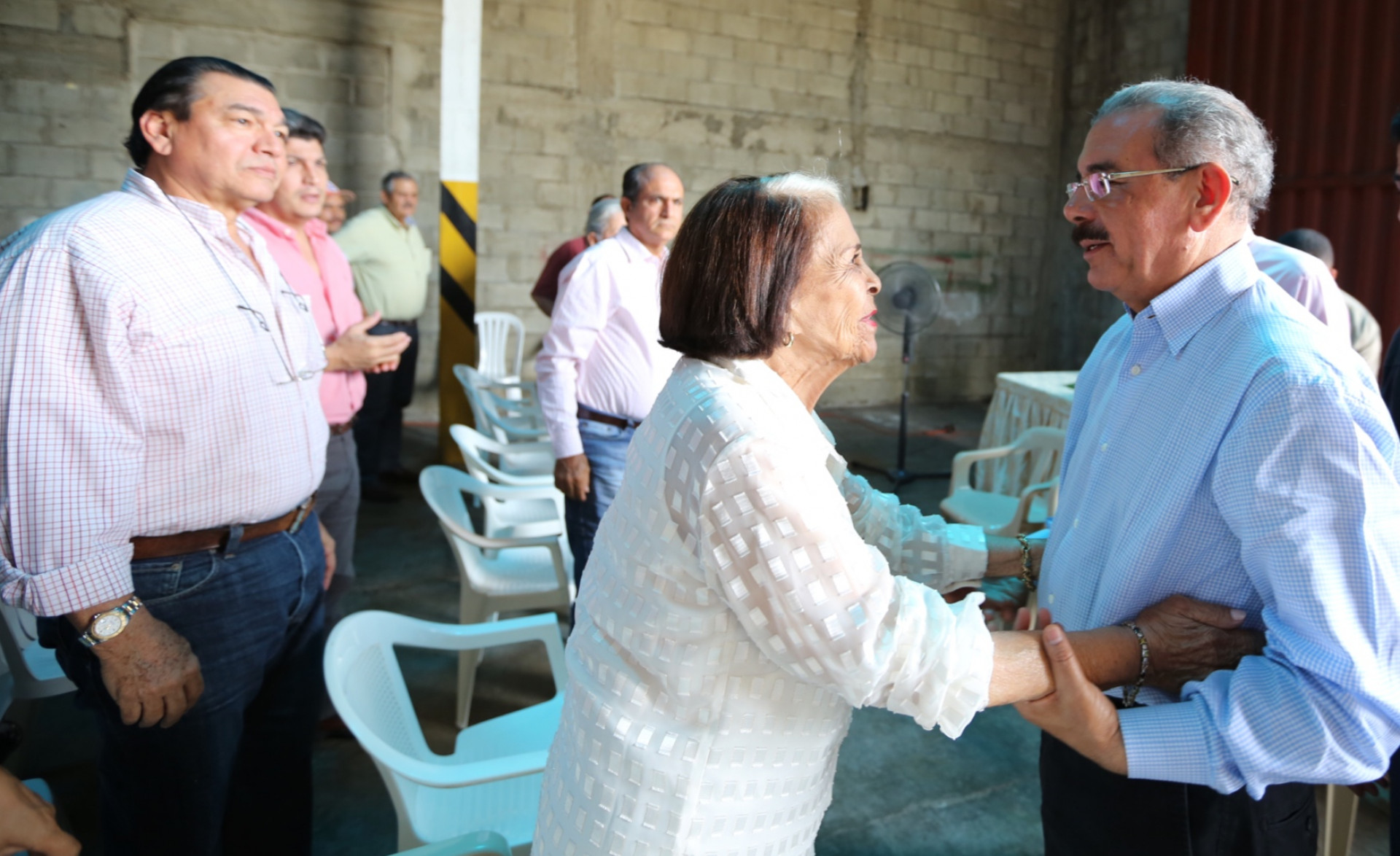Previo a la reunión con miembros y dirigentes de la Asociación de Productores de Cacao del Cibao (APROCACI), del municipio San José de Conuco, el presidente Danilo Medina saluda a doña Dedé Mirabal, hermana de las heroínas Patria, Minerva y María Teresa Mirabal, en cuyo honor fue creado un museo en esa comunidad.
