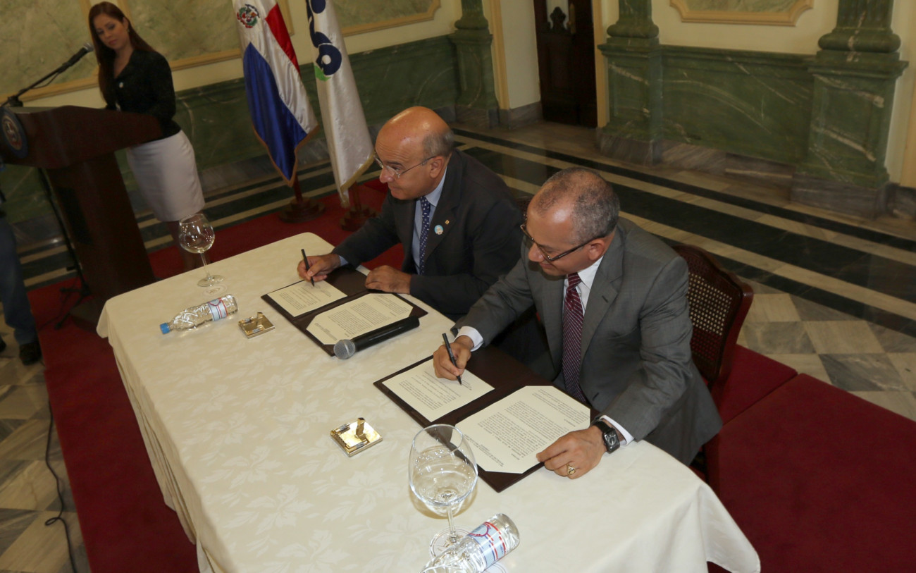 Momento de la firma del convenio de cooperación entre el Ministerio de Salud Pública de la República y el Ministerio de Sanidad de Cataluña, encabezado por el ministro de Salud, el doctor Freddy Hidalgo y el ministro consejero de salud de Cataluña, doctor Boi Ruiz, respectivamente, hoy en el salón verde del Palacio Nacional.