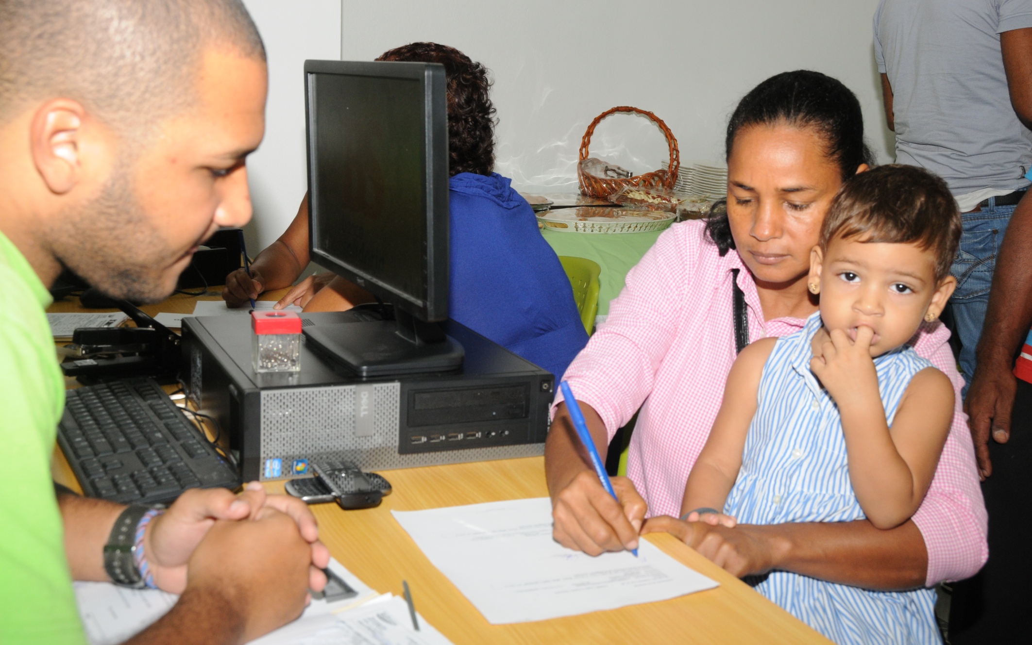 Personal de Servicio de atención al cliente de la nueva sucursal de Banca Solidaria, captado al momento de ofrecer su asistencia a una ciudadana interesada.