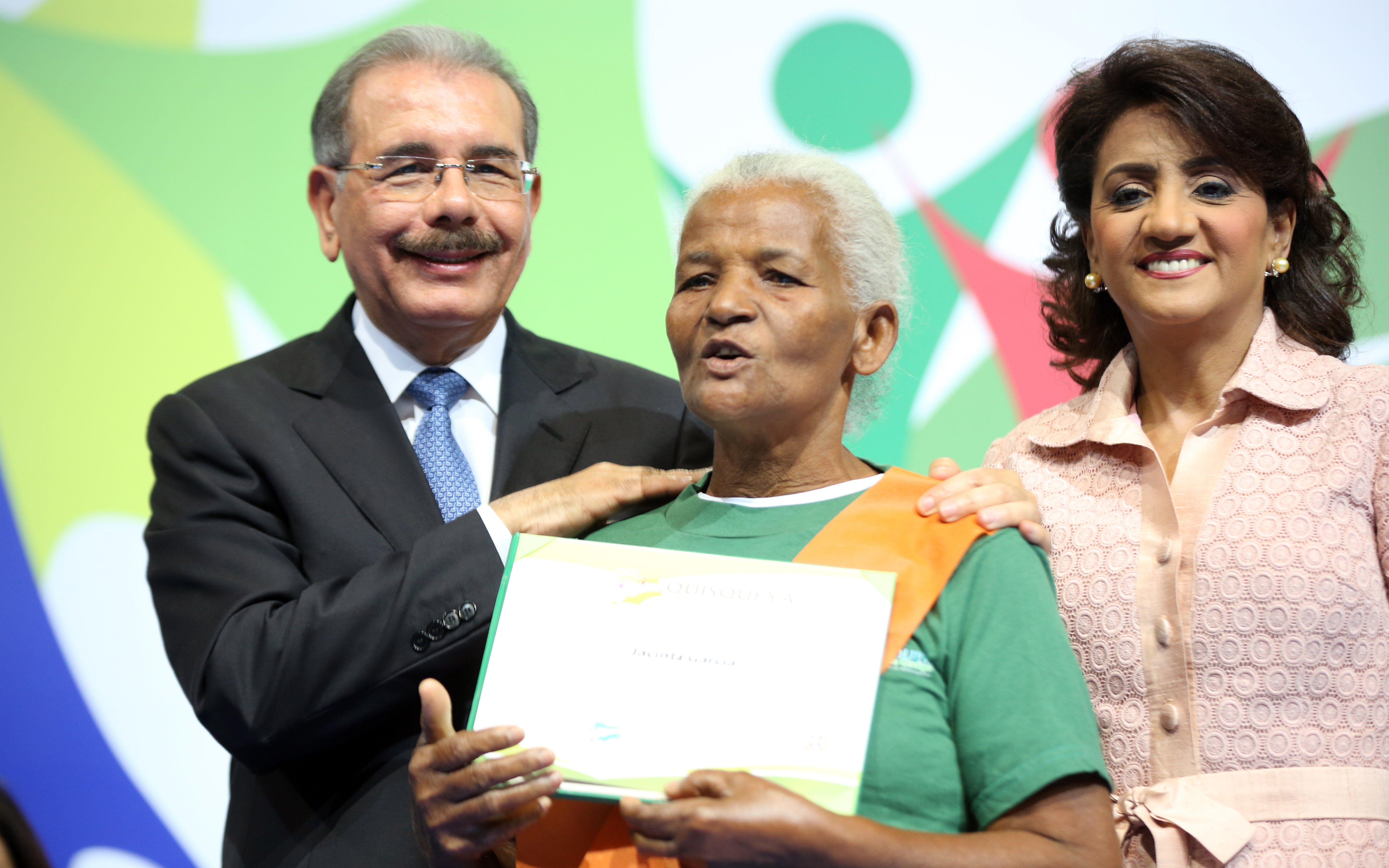 El presidente Danilo Medina y la Primera Dama, al entregar el certificado de reconocimiento a una de las alfabetizadas en el plan Quisqueya Aprende Contigo.
