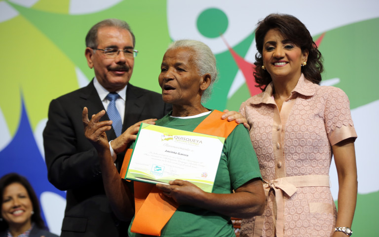 Presidente Medina y la Primera Dama, entregan pergamino a una de las alfabetizadas, mediante el plan Quisqueya Aprende Contigo, en el Palacio de los Deportes.