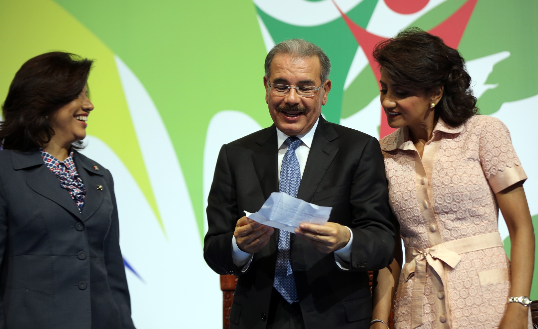 Presidente de la República, Danilo Medina Sánchez, junto a la primera dama, Cándida Montilla de Medina,y la vicepresidenta, Margarita Cedeño de Fernández, muestra su alegría al leer la nota escrita por una de las primeras alfabetizadas el programa Quisqueya Aprende Contigo, cuando participa en el acto de reconocimiento..