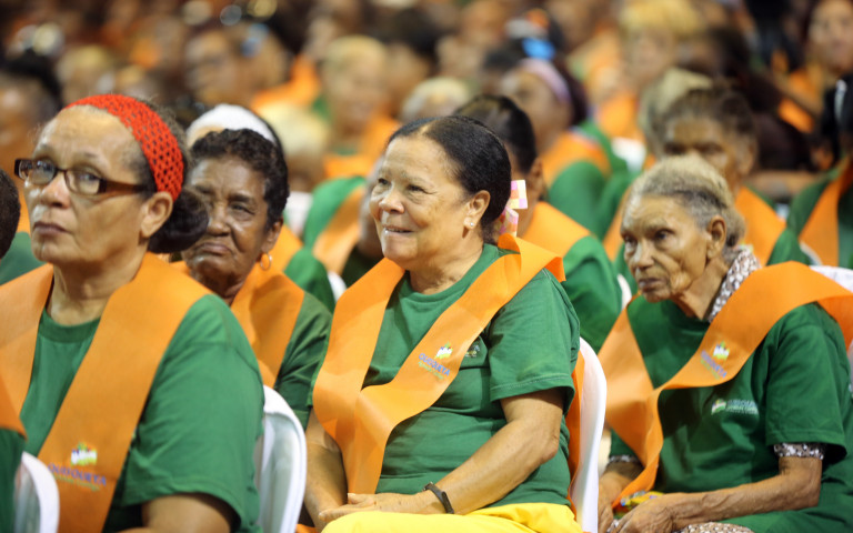 Grupo de damas egresadas del programa de alfabetización “Quisqueya Aprende Contigo”, durante el acto de reconocimiento encabezado por el Mandatario, la Vicepresidenta, la Primera Dama y altos funcionarios, en el Palacio de los Deportes.
