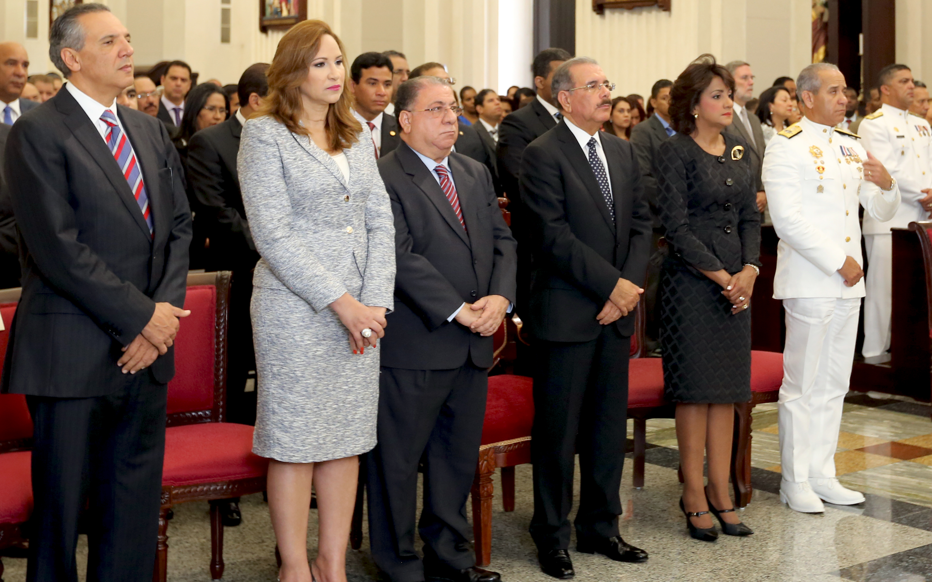 El presidente Danilo Medina acompañado de su esposa, la primera dama Candy Montilla de Medina; el ministro de las Fuerzas Armadas, almirante Sigfrido Pared Pérez; de Interior y Policía, José Ramón (Monchy) Raful; señora Aura Toribio, gobernadora de Santiago; y el ministro Administrativo de la Presidencia, José Ramón Peralta, al presidir el tedeum por el aniversario de la Restauración, hoy en Santiago.