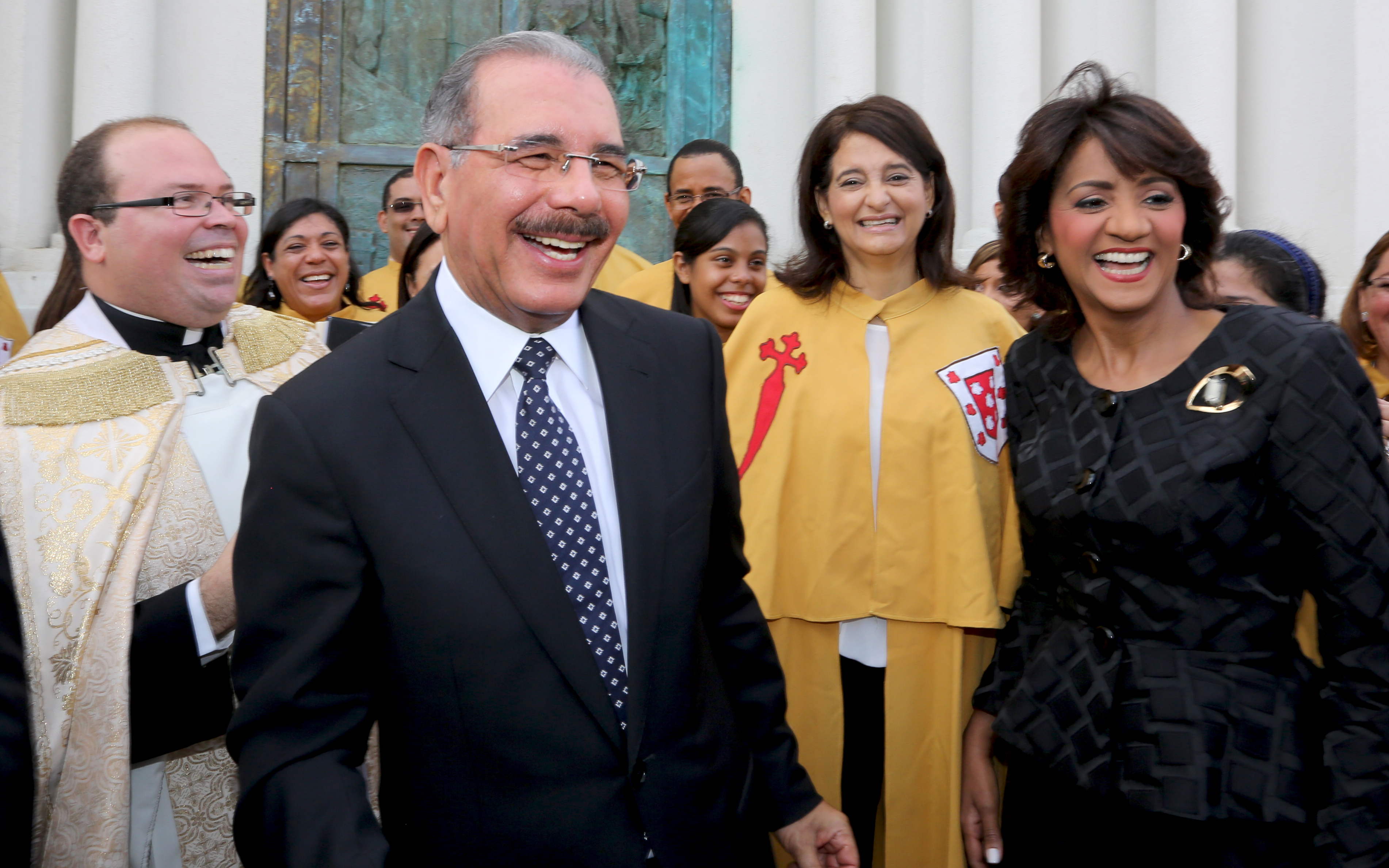 El presidente Danilo Medina y la primera dama, Cándida Montilla de Medina, comparten con integrantes del coro y sacerdote de la Arquidiócesis de Santiago, luego del tedeum efectuado por el 150 aniversario de la Restauración, hoy en Santiago.