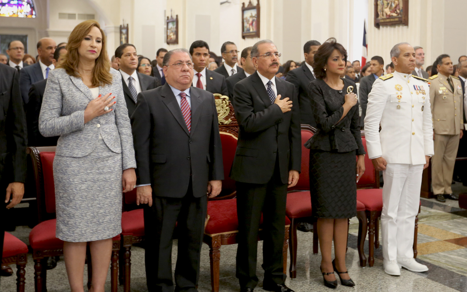 El presidente Danilo Medina acompañado de su esposa, la primera dama Candy Montilla de Medina; el ministro de las Fuerzas Armadas, almirante Sigfrido Pared Pérez; de Interior y Policía, José Ramón (Monchy) Raful; señora Aura Toribio, gobernadora de Santiago, al presidir hoy un tedeum por el aniversario de la Restauración.