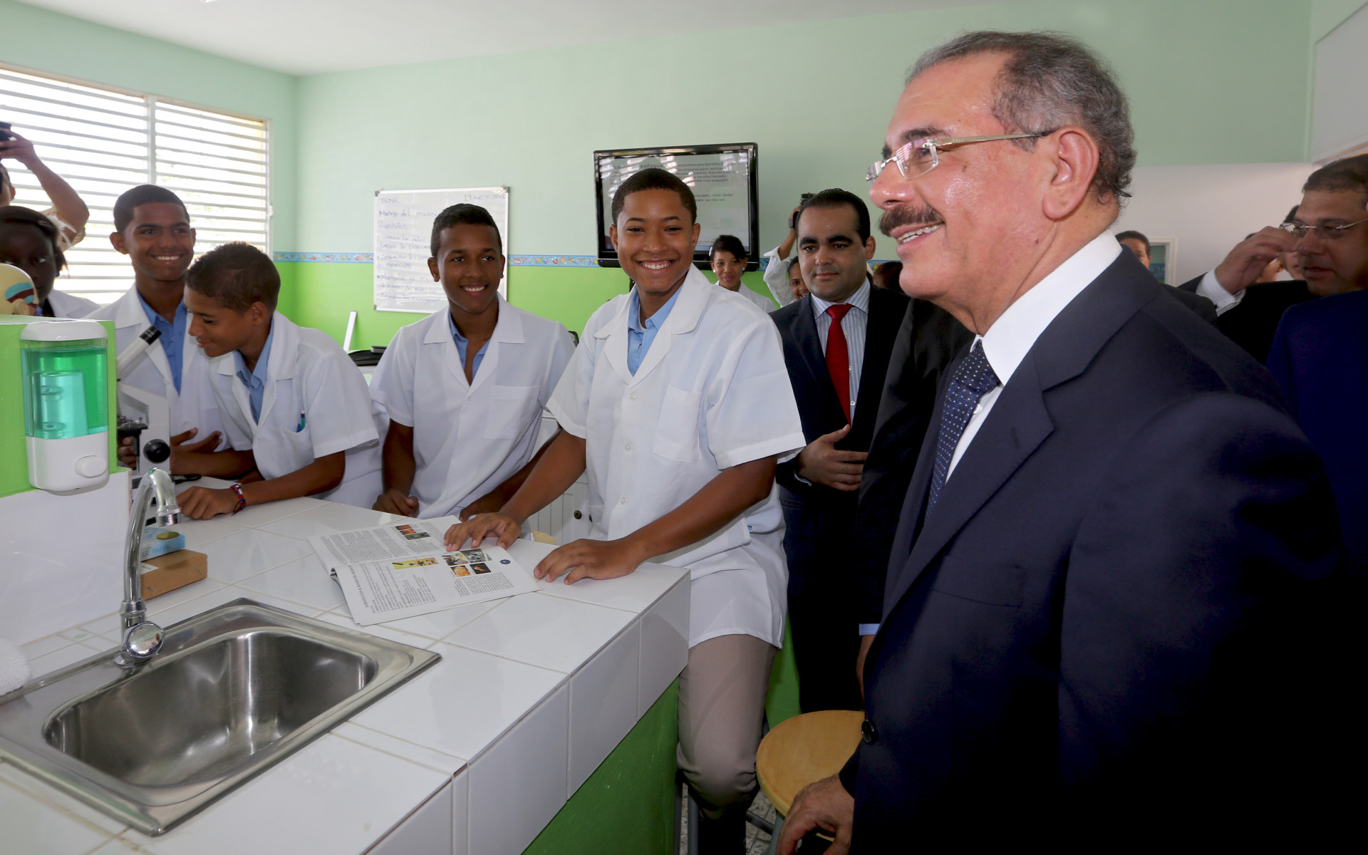 El presidente Medina con estudiantes del Liceo Madre Teresa de Calcuta, durante su recorrido por el centro educativo.