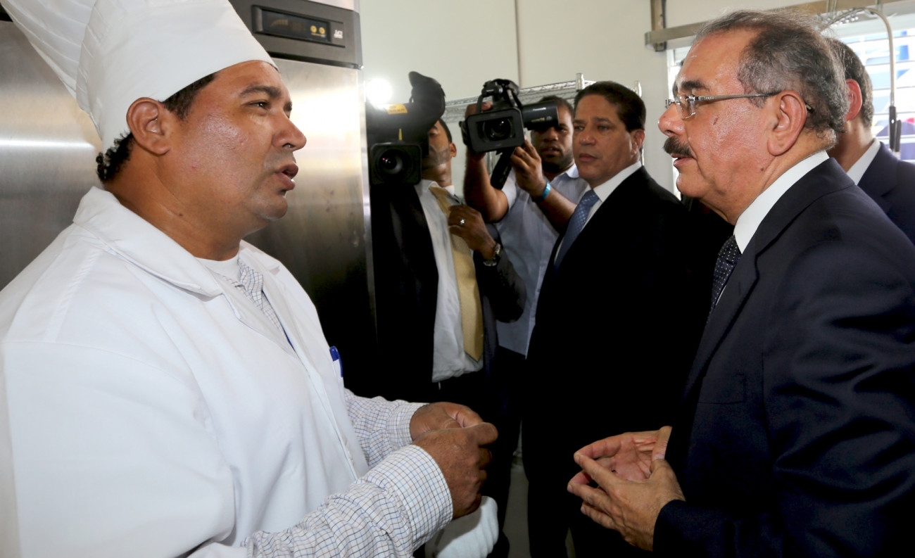 El presidente Danilo Medina y el cheff asignado al Liceo Madre Teresa de Calcuta, durante el recorrido del mandatario por las diferentes áreas del centro educativo.