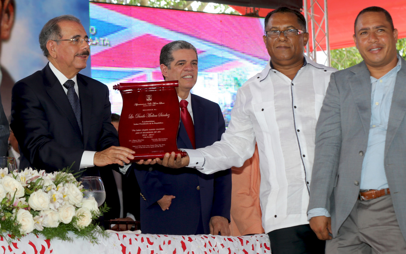 El presidente Danilo Medina y representantes de la Sala Capitular de Montellano, durante la entrega de una placa de reconocimiento al Jefe de Estado y declaró Día de Regocijo Municipal.