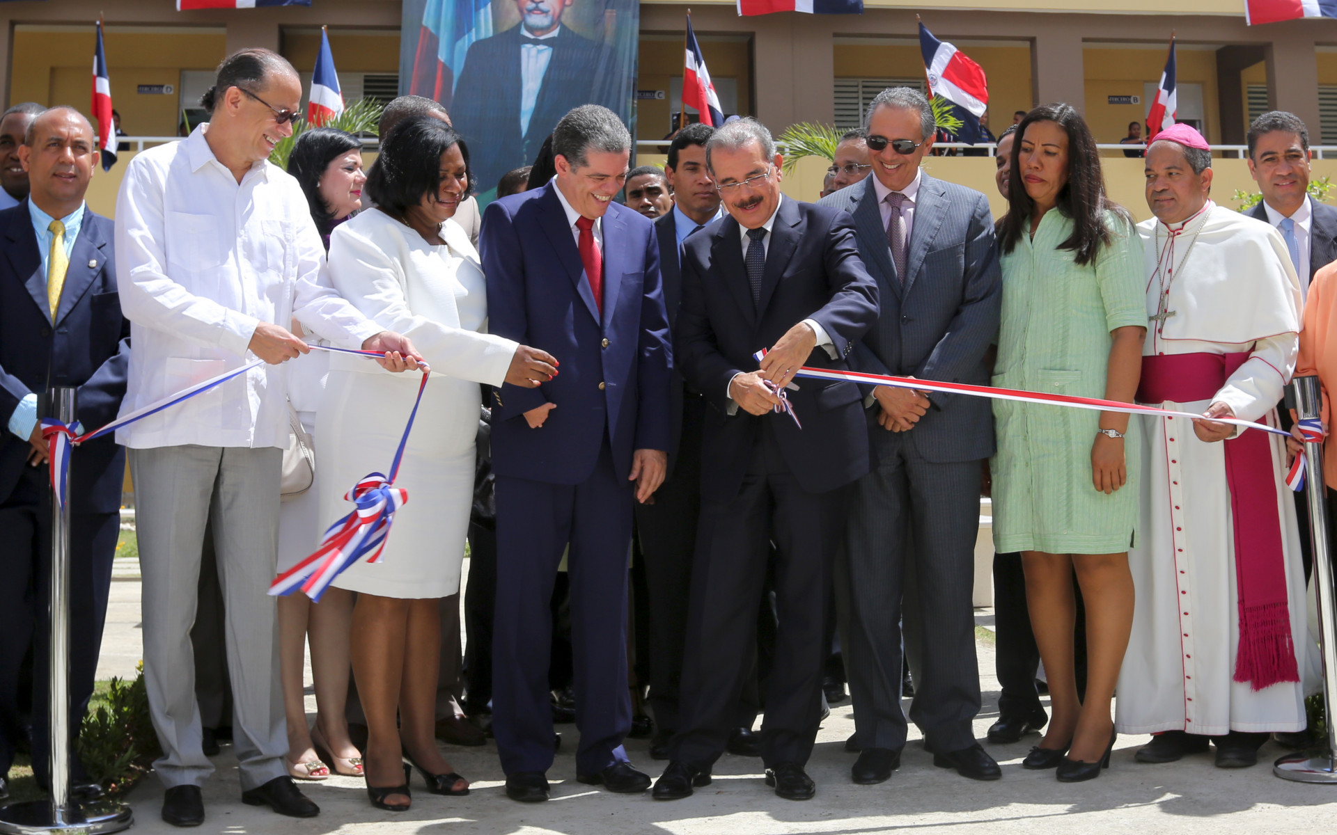 Corte de cinta en acto de inicio año escolar 2013-2014, encabezado por el presidente Danilo Medina. Figuran además, el ministro de Educación, Carlos Amarante Baret; el ministro de Cultura, José Antonio Rodríguez; señora Fridanela Simons, directora regional de Educación; el ministro administrativo de la Presidencia, José Ramón Peralta; monseñor Julio César Corniel, obispo de la Diócesis de San Felipe, entre otras autoridades.