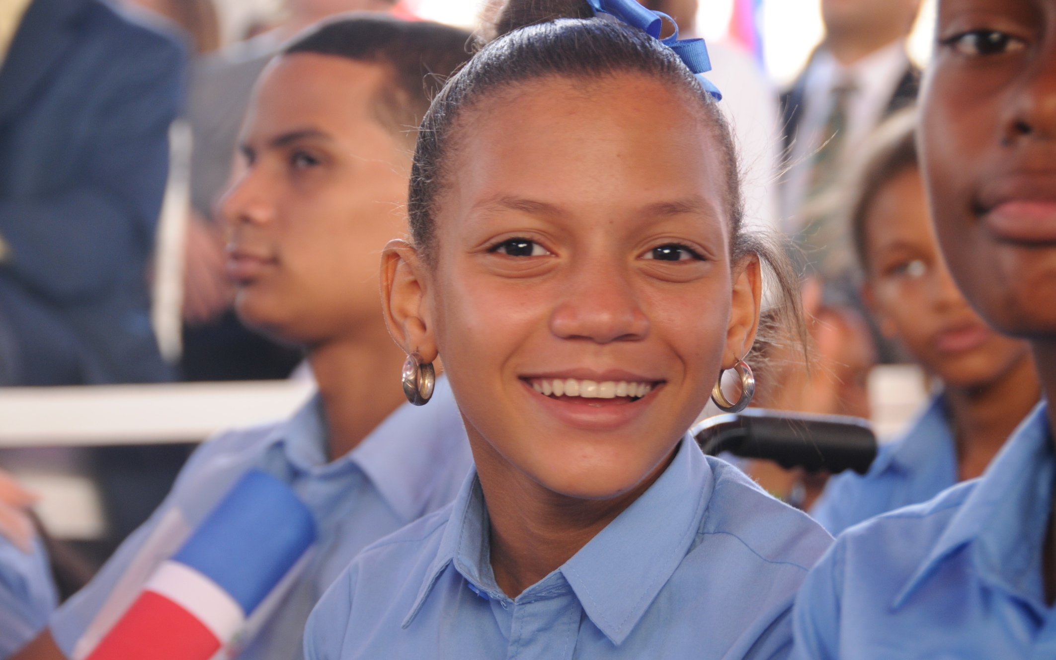 Estudiante del Liceo Madre Teresa de Calcuta, en Montellano, Puerto Plata, evidencia su felicidad en el acto inaugural por la apertura del nuevo año escolar 2013-2014, que contó con la presencia del Mandatario.