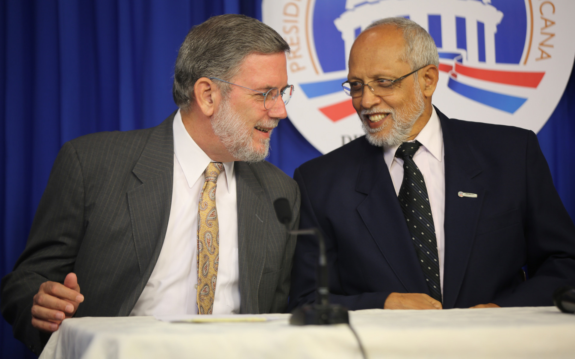 Roberto Rodríguez Marchena, director de DICOM y Pedro Luis Castellanos, director general de Programas Especiales de la Presidencia, invitado del Encuentro con los Medios, al hablar sobre el Plan de Protección y Atención Integral de la Primera Infancia Quisqueya Empieza Contigo, en el Salón Orlando Martínez del Palacio Nacional.