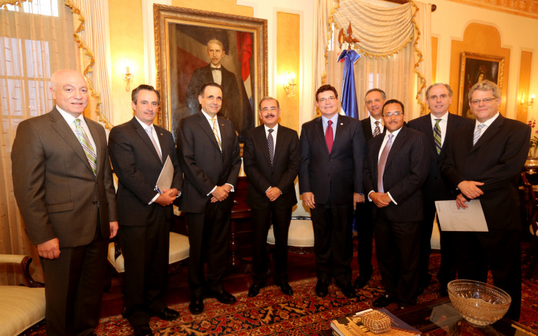 El presidente Danilo Medina con integrantes del comité ejecutivo de la Cámara Americana de Comercio, encabezados por los señores Máximo Vidal, Gustavo Tavares Kelner, David Fernández Whipple, Ramón Ortega, Pedro Esteva, Julio Brache y William Malamud, durante visita de cortesía en su despacho del Palacio Nacional.