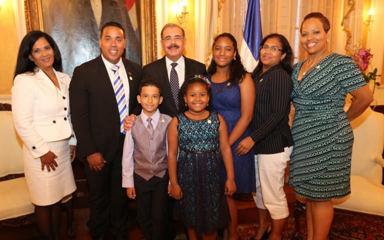 El presidente de la República, Danilo Medina, con los niños dominicanos Joshua Virgilio Mendoza, Génesis Bexabet Peña Paulino y Leslie Hiciano García, reconocidos por la Cámara de Diputados de la República Dominivcana por el alto rendimiento escolar en el Estado de New Jersey donde residen. Figuran también el Comisionado del Departamento de Educación de la ciudad de Paterson, Alex Méndez; las madres de los estudiantes, Esperanza Rubina García, Wendoly Yissel Paulino Medrano, Yvelise Altagracia García Méndez, y demás acompañantea, durante su visita de cortesía al Palacio Nacional.
