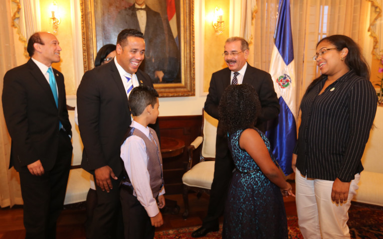El presidente de la República, Danilo Medina, al saludar a los niños dominicanos Joshua Virgilio Mendoza, Génesis Bexabet Peña Paulino y Leslie Hiciano García, reconocidos por la Cámara de Diputados de la República Dominivcana por el alto rendimiento escolar en el Estado de New Jersey donde residen. Figuran también el Comisionado del Departamento de Educación de la ciudad de Paterson, Alex Méndez; las madres de los estudiantes, Esperanza Rubina García, Wendoly Yissel Paulino Medrano, Yvelise Altagracia García Méndez, y demás acompañantes, durante su visita de cortesía al Palacio Nacional.